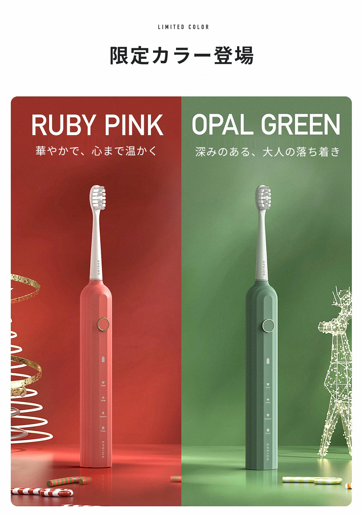 Epeios 電動歯ブラシ クリスマス限定 ルビーピンク/オパールグリーン 音波振動 IPX7防水 180日使用 静音 歯垢除去 ギフト 爆買