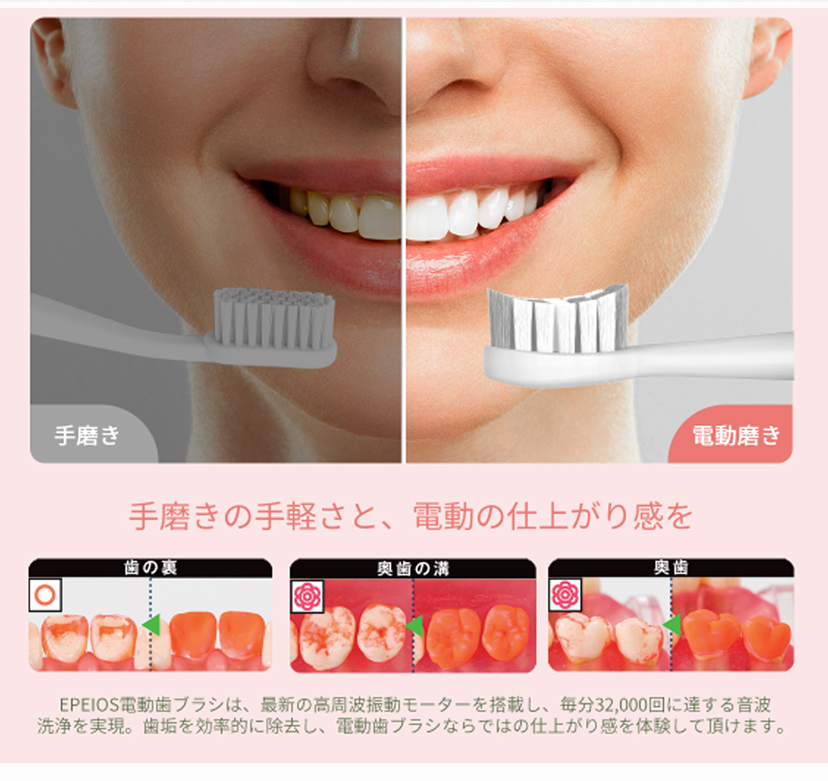 電動歯ブラシ EPEIOS Okare! 音波式 IPX7防水 静音 180日使用 音波歯ブラシ 音波振動歯ブラシ 歯垢除去 USB充電 プレゼント 爆買