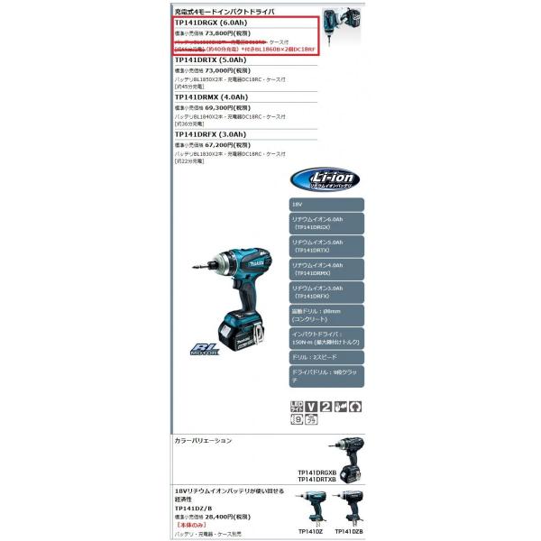 マキタ TP141DRGX18V 6.0Ah充電式4モードインパクトドライバ(最速40分充電モデル)