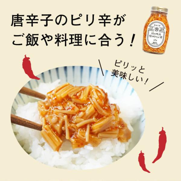 唐辛子がピリッと効いた、ご飯のお供にぴったりの健康なめたけです。