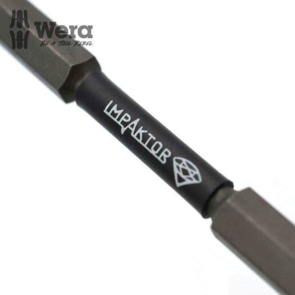 ■インパクタービット ドイツWERA社が新たに開発したIMPAKTOR(インパクター)ビットは、独自技術により先端に特殊ダイヤモンドコーティングを施し、その強力な「食い付き」効果によりビット先端からネジ頭から滑って逃げる「カムアウト」現象を極限まで防いでくれます。
