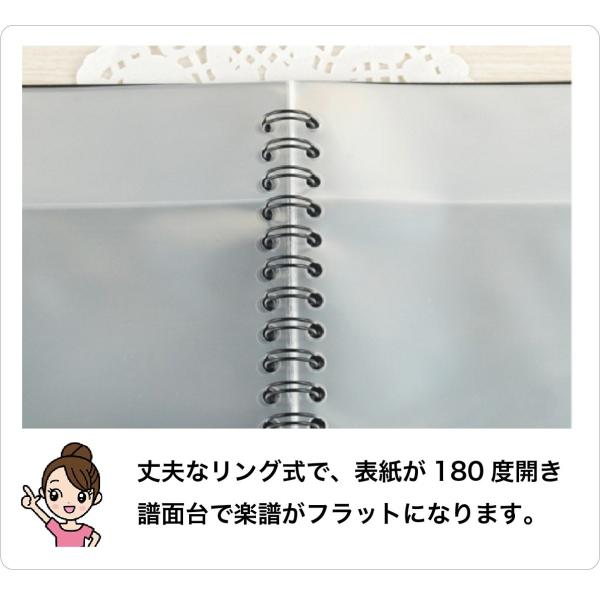 ・リング式で譜面台の上でページを180度開くことが出来ます。