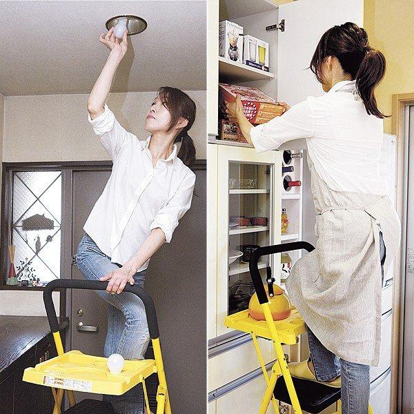 トレイ が 付いてる 黄色い 折りたたみ式 の 脚立