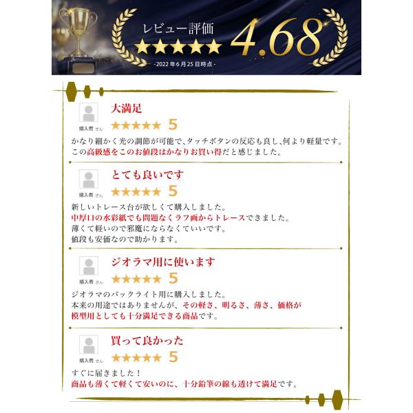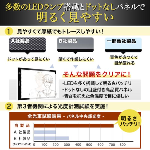【第3者機関での品質確認 ライトテーブル 】日本の試験機関でチェックを行い確かな品質を確認。プロイラストレータに推薦いただいています。パネルは高品質なものを採用し明るくみやすいので漫画原稿用紙スクリーントーンを使ったトレースやイラスト作成製図に最適。色温度の調整を行い刺激的な青みを緩和しつつ明るさを保ち負荷低減の対策。ブルーライトの対策も行い目へ有害と言われる光を和らげる。