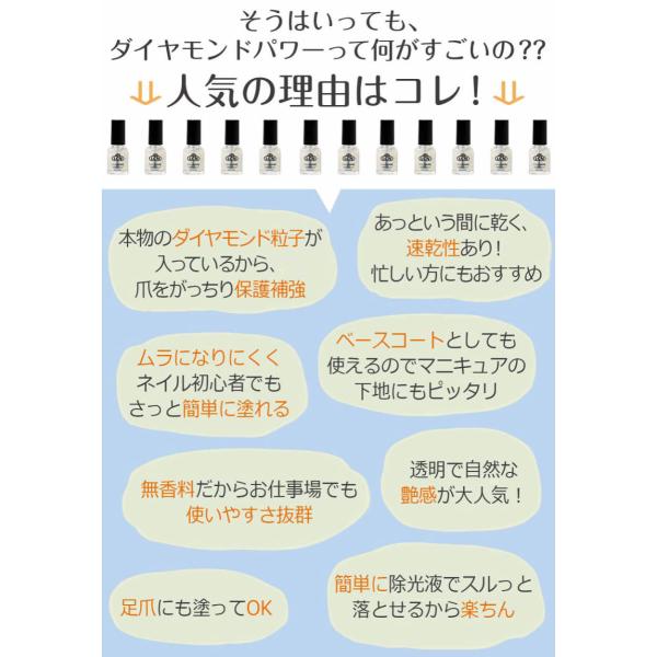 含有成分に本物のダイヤモンドパウダー(微小粉末)が入っており、その粒子が爪を保護し、光沢を与えてくれ、爪の保護と美しさが両立できるベースコート兼トップコートの逸品です。