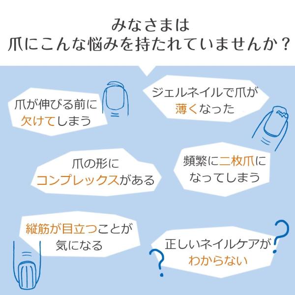 ネイルケア後の爪、または爪が弱い、もろい爪などでお困りの方は、ベースコートとして爪に薄く塗ってご使用ください。 また、カラーリング後の爪のトップコートとしてご使用いただくことも出来、その場合はよりカラーリングが長持ちし、強く美しく仕上がります。