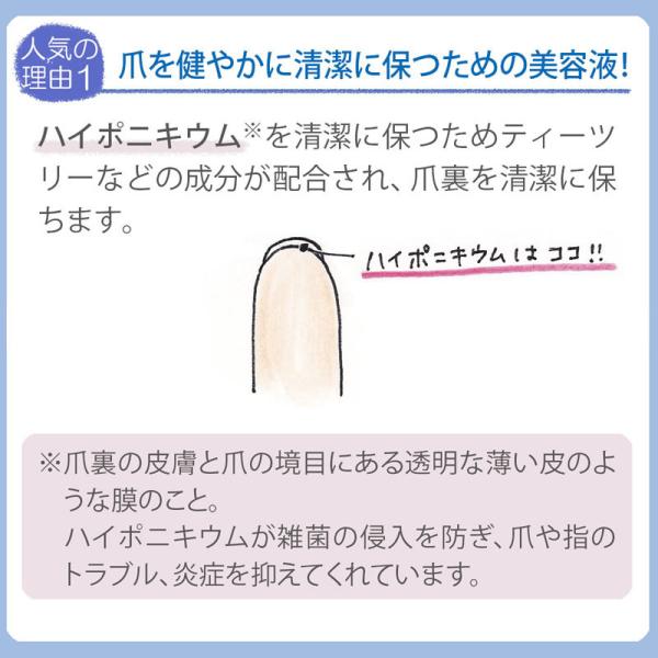 爪が弱いとお考えの方向けに爪の裏側に1日に2−3回お使いいただくことで、配合成分がハイポニキウム(下記1参照)へ浸透し、爪を清潔に保ち、健やかに育成する助けをしてくれます。爪の?離(下記2参照)ケアにもおすすめです。