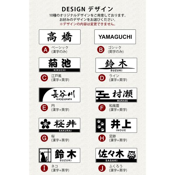 【ご注意】デザイン・フォント(書体)の変更はできません。漢字のみのデザインに、漢字と英字をご記入いただいてもデザイン通り「漢字のみ」で作成させていただきます。 また、「漢字+英字」のデザインで、「漢字のみ」もしくは「英字のみ」どちらかしか記入していない場合は、記入していただいている内容で中央にし作成させていただきます。