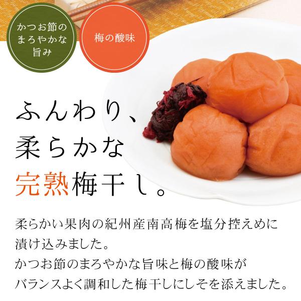 柔らかい果肉の紀州産南高梅を漬け込み、かつお節のまろやかな旨みと梅の酸味がバランスよく調和した梅干にしそを添えました。