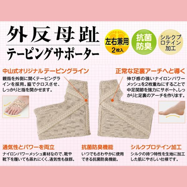 中山式 外反母趾 テーピングサポーター 2枚入り 日本製 医療メーカー 公式 抗菌 防臭 保護 ベージュ 開く 足 足指 親指 靴 靴下 薄手 22.5〜25.0cm