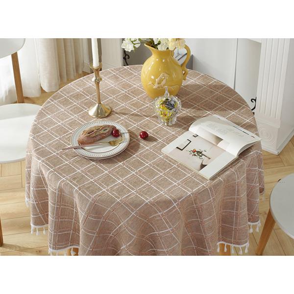 レトロな雰囲気のある円形テーブル用テーブルクロスです。おしゃれなチェック柄と絶妙に褪せたブラウンカラーの組み合わせがお部屋をゆったりしたムードに演出します。チェック柄にはラメが入った箇所もあり、さりげないワンポイントとしてほんの少しティータイムを華やかにします。しっかりした生地感でテーブルの汚れや傷防止だけではなく、コーヒーテーブルの模様替えや撮影用生地としてもおすすめです。