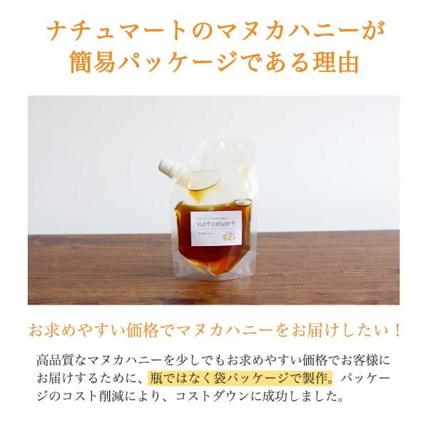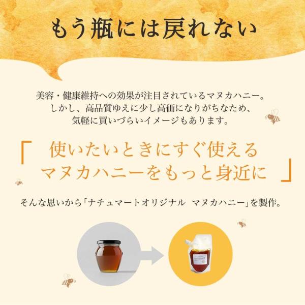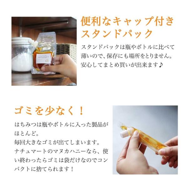 【詳細説明】栄養価の高さから美容・健康維持への効果が期待されているマヌカハニー。そんなマヌカハニーのお試しサイズが登場!ニュージーランドからきたスーパーフード「マヌカハニー」を、瓶ではなく袋パッケージに。さらに気軽にお試しいただけるサイズにしました。便利なうえにゴミも少なく、コンパクトなスタンドパックなので保管の場所もとりません。まずはお試しください!