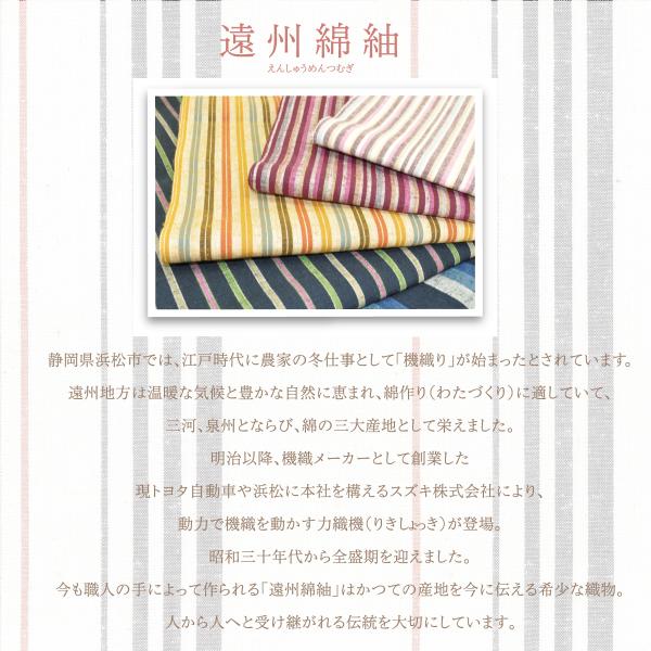 ・独特な柄は、遠州縞・縞紬・無地紬・絣紬・なないろ紬と呼ばれ布に温かい風合いが出るようネップ糸・リング糸などを使用した、ざっくり調の柔らかな布地グループなのが特徴です。