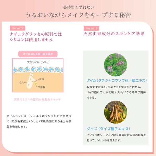 ナチュラグラッセの原料ではシリコンは使用しません。オイルコントロール ミルクはシリコンを使用せずに、天然由来成分(シリカ)で肌表面にある余分な皮脂を吸着します。