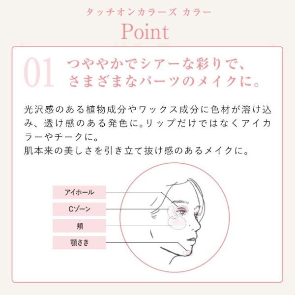 ・光沢感のある植物オイルやワックス成分に色材が溶け込み、透け感のある発色に