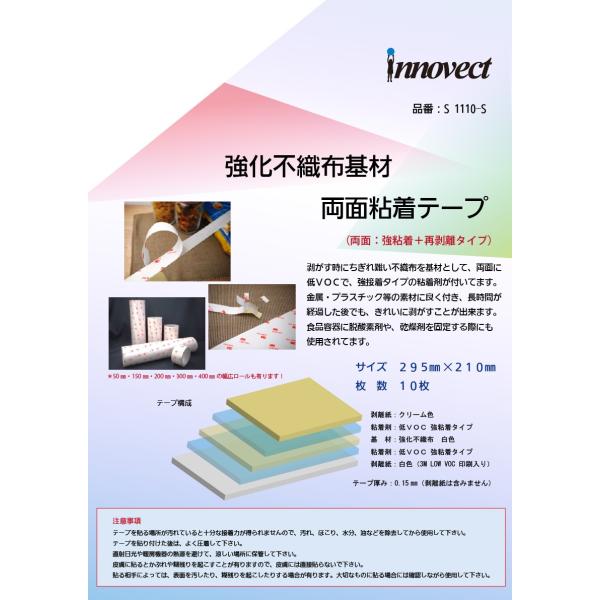3M 強化不織布基材 両面テープ No.1110 295mm×210mm 10枚入【強力接着で低VOCタイプのアクリル系粘着剤の付いた両面テープ】