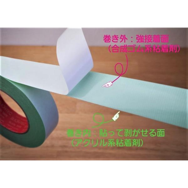 手切れ性のあるポリエチレンクロスを基材として、片面には強接着タイプの合成ゴム系粘着剤、反対面には貼って剥がせるタイプのアクリル系粘着剤が付いた両面テープです。