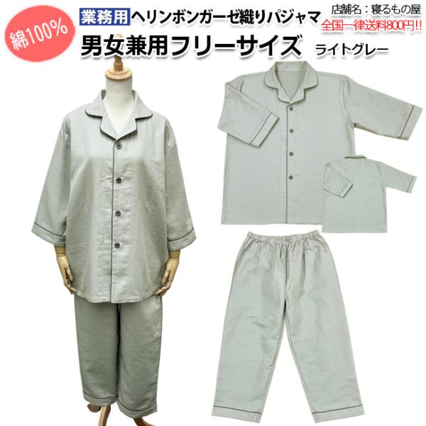 パジャマ業務用 綿100% 大人用フリー ヘリンボーンガーゼ接結織り 前ボタン開き 上下セット ライトグレー 三露産業 病衣 部屋着 ホテル 旅館 民宿 民泊
