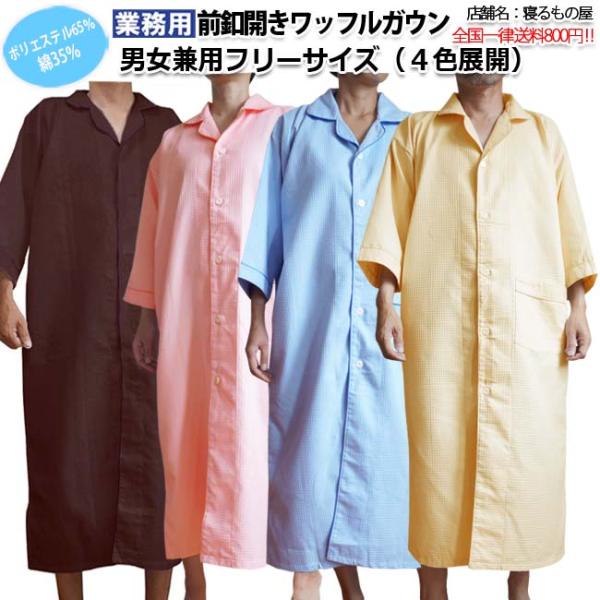 ガウン業務用 ポリ65% 綿35% 大人用フリー ワッフル前ボタン開き ポケット付 ベージュ ブラウン ピンク サックス 三露産業 パジャマ 病衣 部屋着 ホテル 民泊