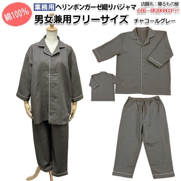 パジャマ業務用 綿100% 大人用フリー ヘリンボーンガーゼ接結織り 前ボタン開き 上下セット チャコールグレー 三露産業 病衣 部屋着 ホテル 旅館 民宿 民泊