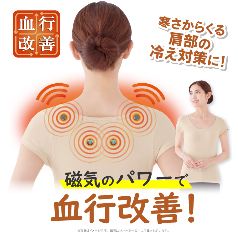 永久磁石(ネオジウム磁石)を肩から肩甲骨にかけて4個配置。磁気の力でコリの緩和と血行を改善します。