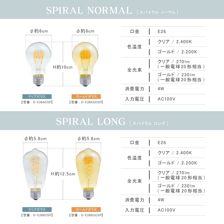 人気のエジソンバルブLED電球の、螺旋状に光るフィラメントが印象的な【スパイラル】シリーズ。