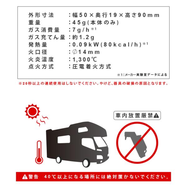 見た目のコンパクトさからは想像もつかない強力なターボ炎。風が強い屋外でも簡単に着火することができるので、キャンプでの火おこしやストーブの着火などにも最適。火力が強いので料理の焦げ目付・炙りにもおすすめです。