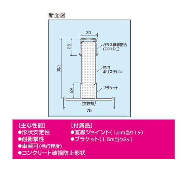 キャップ側面の曲線部分の働きで、土間コンクリートの破損を防止、施工完了時の仕上りを持続的に維持します。また、ガラス繊維を配合することにより、形状安定性を向上させ、縮み・反りを軽減、耐衝撃性もアップしました。キャップは、カッターにて裁断可能で施工性もアップ。施工性重視、経済性重視、土間、カーポートコンクリートのことを考えた成形伸縮目地です。