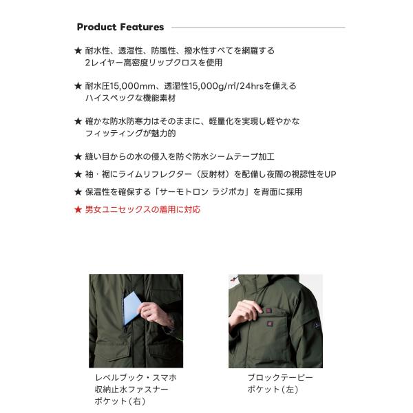 耐久撥水加工、耐水圧15,000mm、透湿性15,000g/m2/24hrs(ラミネートコーティング) 裏地:全天候型保温素材「サーモトロンラジポカ」、帯電防止「メガーナ」
