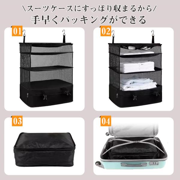【折りたたみ&吊り下げ収納】旅行や出張の際、荷物を入れて折り畳んで、スーツケースをきちんと保つことができます。 旅先に着いたらフックで吊るだけですぐクローゼットになります。通気性がいいし、中のものも一目瞭然で、時間を節約、頻繁に出張に行く身としては非常に便利です。