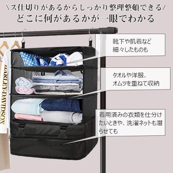 【4段式収納】上の三層は雑物や衣類をそれぞれに収納できます。吊り下げ収納ボックスは一番下層はファスナーポケット層で、汚れた衣類や靴の収納に便利、生地の一定の防水性があり、他の物を汚さない。最上層と底層は両側にはメッシュポケットがあり、データケーブル、バンクカード、パスポート、靴下、ネクタイなどの小物の収納に便利です。