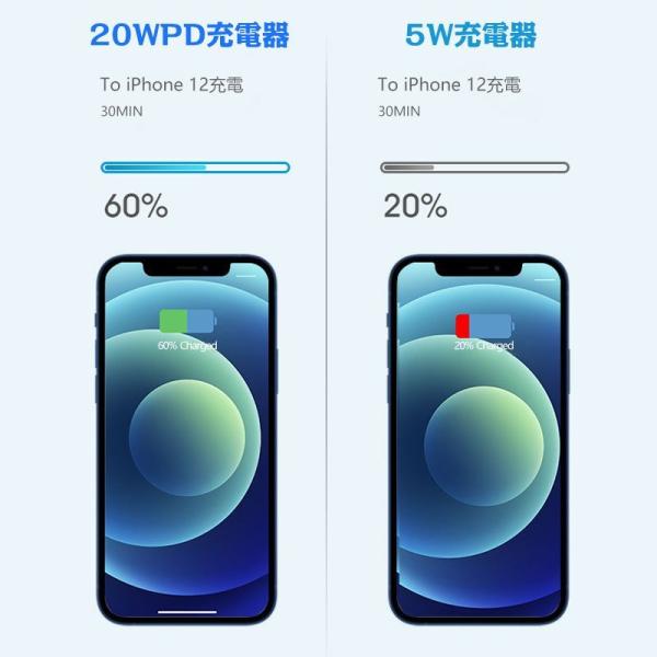 【20W PD 急速充電】高速充電対応の USB C Power Delivery 3.0 機能を搭載しており、20W出力のフルスピード充電によりわずか30分でiPhone 12を最大60%まで充電可能です。