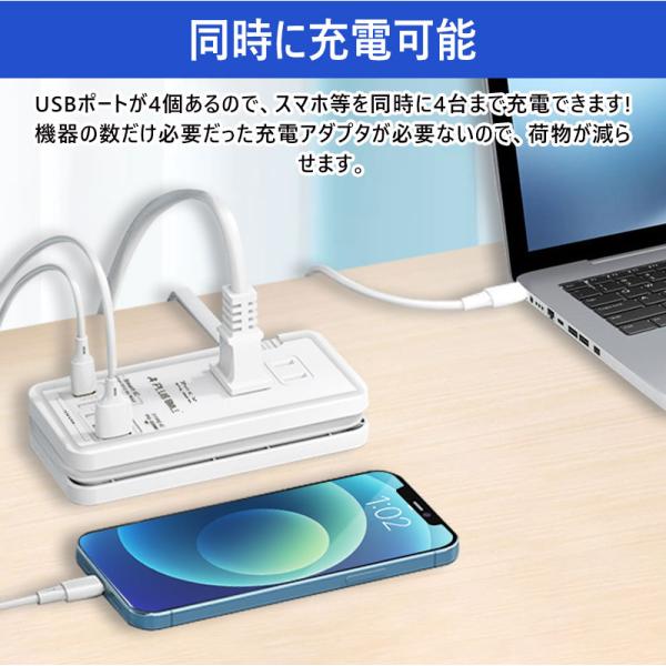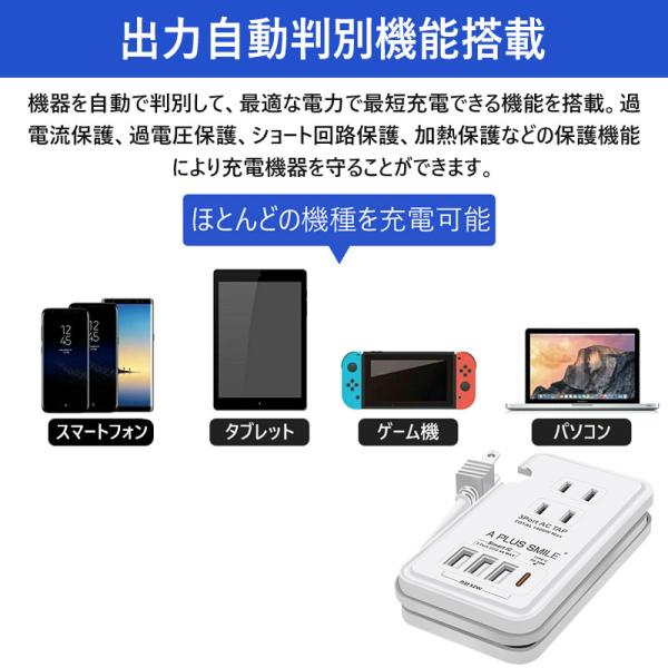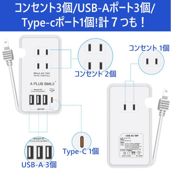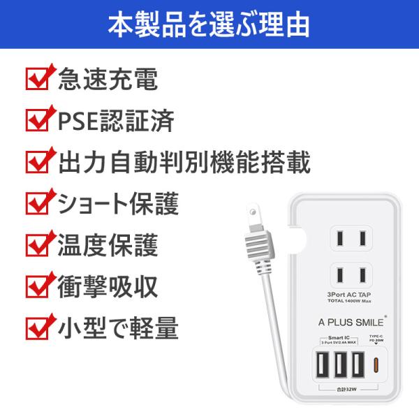 電源タップ ACアダプター USB コンセント PD 20W 急速充電ポート 1つUSB-C 3個USB充電ポート 3つACコンセント PSE認証 電源ケーブル20cm 過電保護 軽量