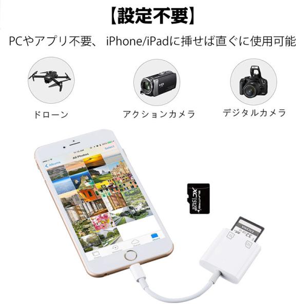 iPhoneやiPadに接続し、SDカード、microSDカード内のデータを直接転送することが出来ます。