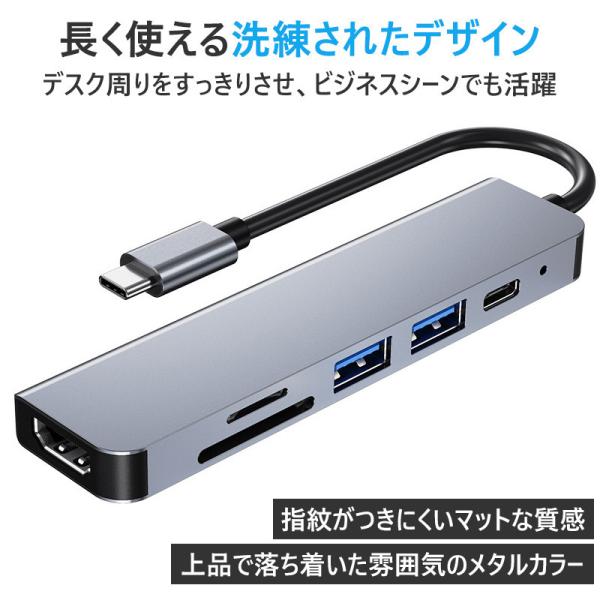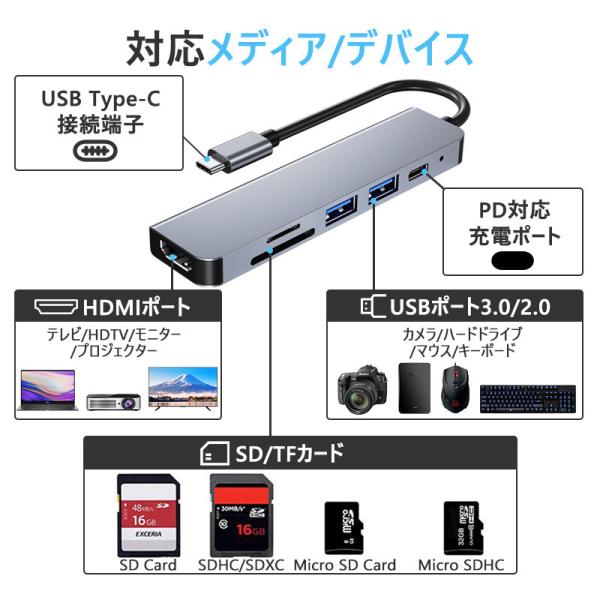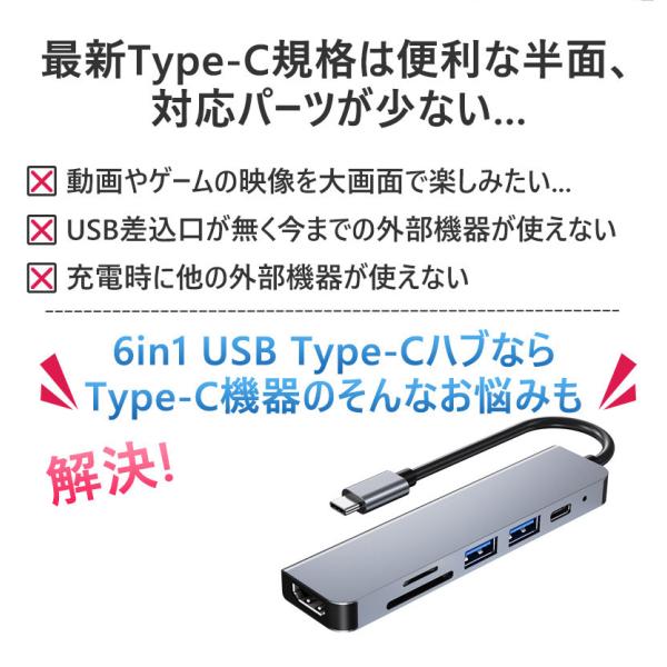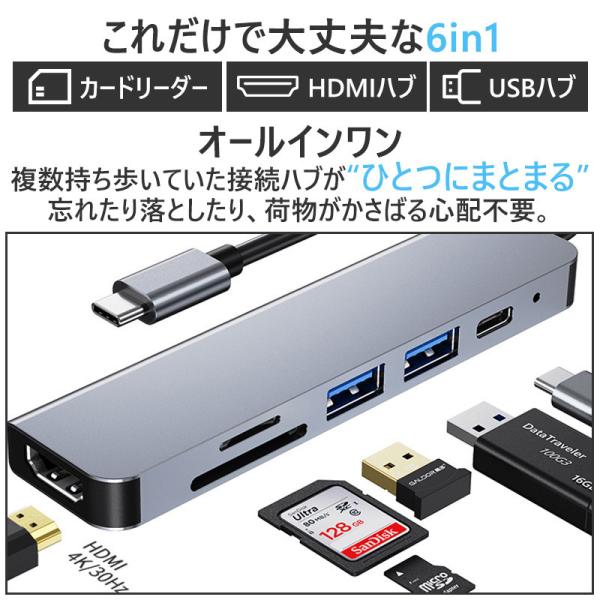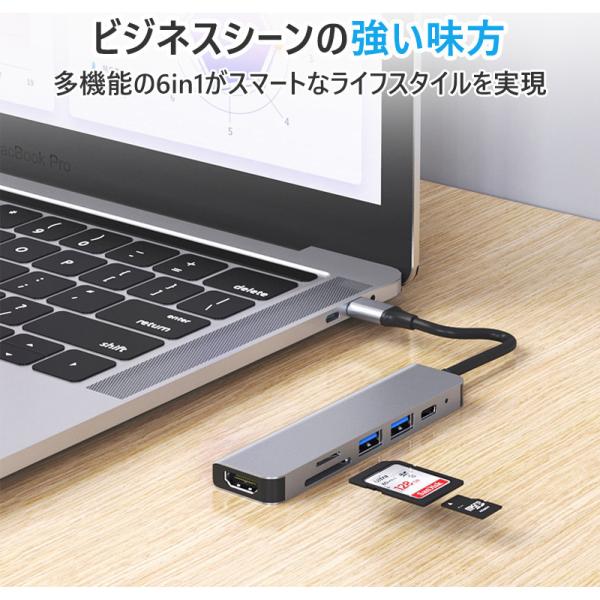 USB Type-C ハブ 6in1 SDカードリーダー HDMI ポート 4K PD対応 USB 3.0 USB-C タイプC Macbook Android iPad ノートパソコン Windows Surface 高速転送