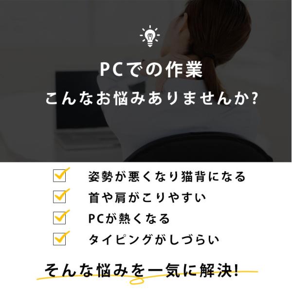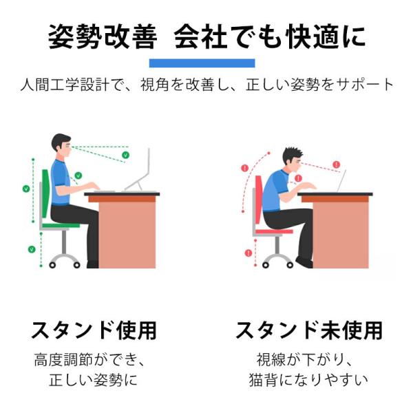 人間工学に基づいた設計により、高さを50mmから150mmまで6段階に調整できる機能を備えています。これにより、目線が上がり、身体の姿勢が改善されます。長時間のデスクワークによる首、肩、背中などへの負担が軽減され、快適な作業環境を実現します。