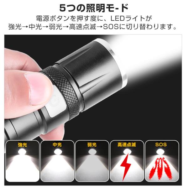 充電式LED懐中電灯は片手で簡単に操作でき、スイッチで5つの異なるモードを切り替えることが可能(高―中―低―フラッシュ―SOS)。長押しすると電源がオフになります。