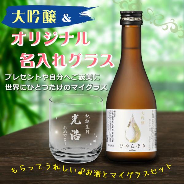 送料無料 エッチング グラス彫刻&日本酒セット 大吟醸 ひやしぼり 300ml ロックグラス 名入れ彫刻 選べるデザイン&メッセージ (北海道・沖縄+890円)