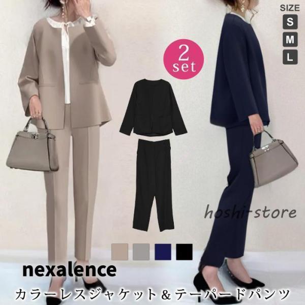 セットアップ レディース スーツ 秋 冬 秋冬 2点セット 黒 紺 ジャケット パンツスーツ ノーカラー スーツ テーパード ブラック ベージュ ネイビー