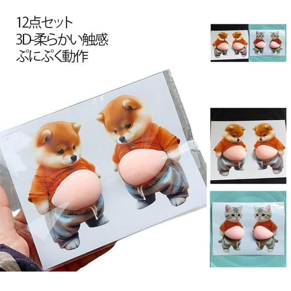 12点セット お腹ぷにぷにシール おなかシール 猫 犬 ぷにぷにシール シール もっちりシール 12点セット 3D柔らかい お腹 ぷくぷくシール お腹