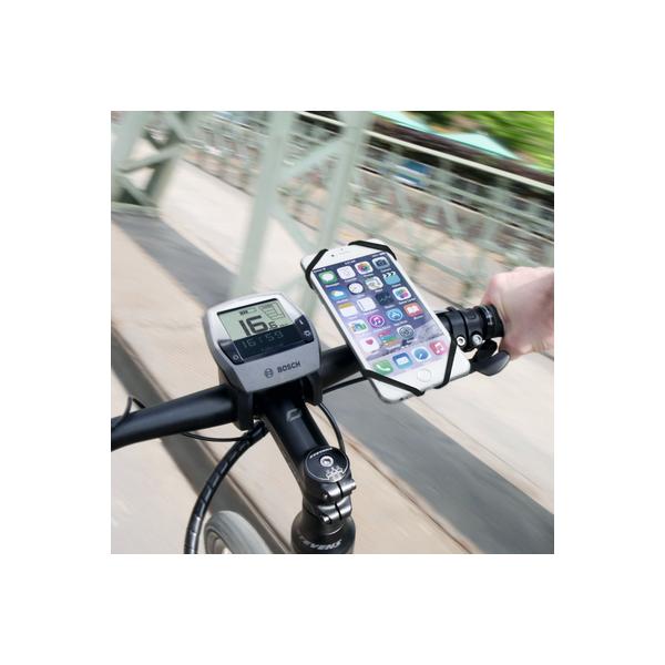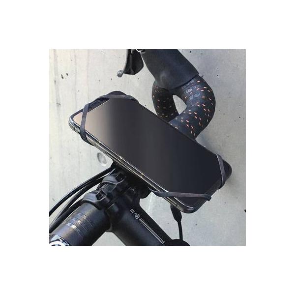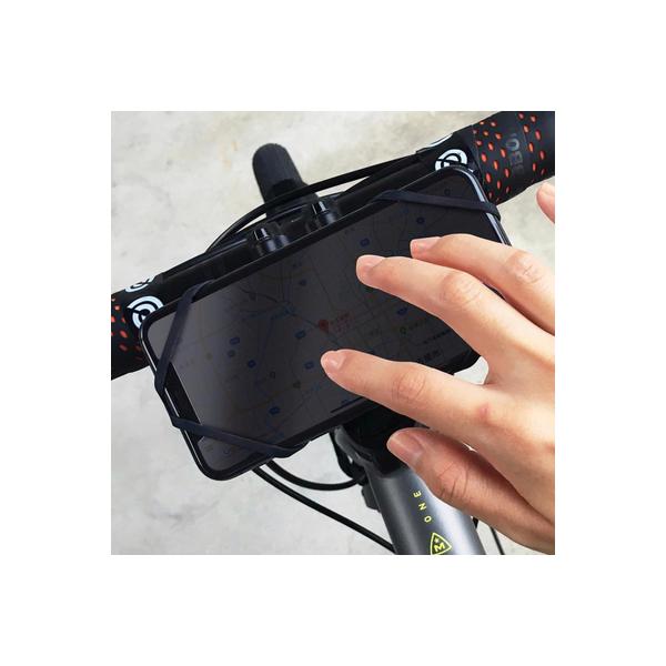 シリコン製バンドでスマートフォンを覆い、ハンドルバーには滑り止めラバーと