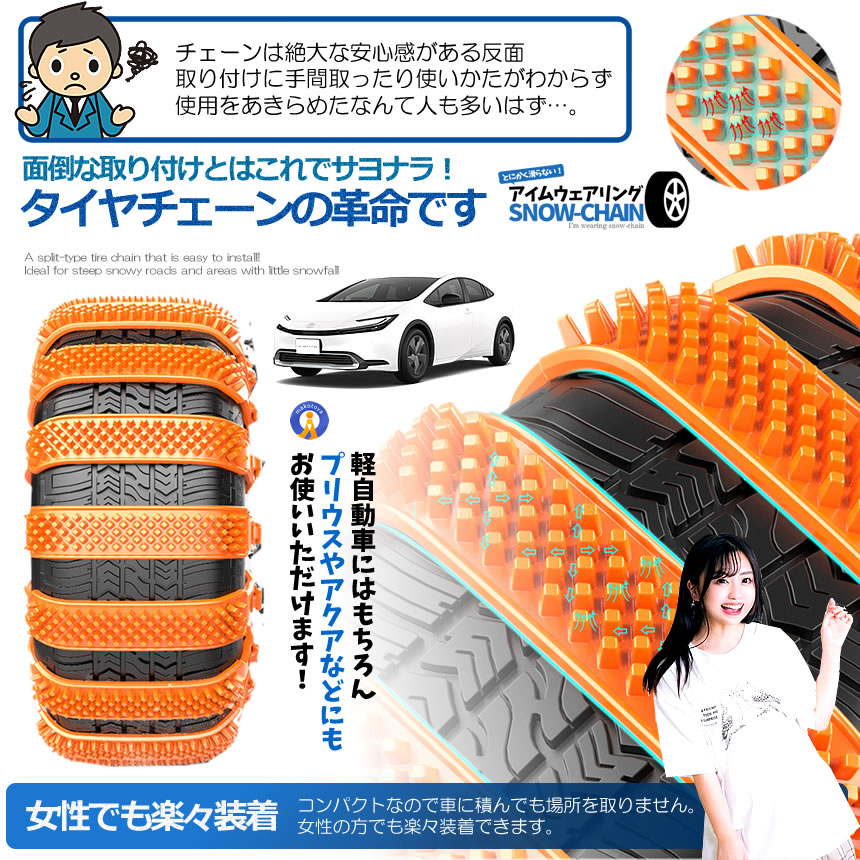 2個セット スノーチェーン 10本セット サイズ調節可能 非金属 車用 ゴム素材 アイスバーン スリップ防止 簡単装着 タイヤチェーン 雪道走行 緊急時 YUKICHAIN