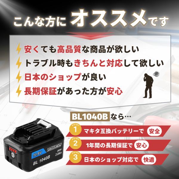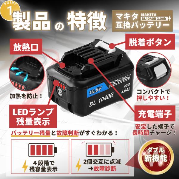 マキタ 互換品 バッテリー BL1040B 10.8v 3.0Ah 掃除機 LED残量表示 純正充電器対応 PSE認証 日本企業 10億円PL保険 1年保証 (BL1040B 3.0Ah 1個)