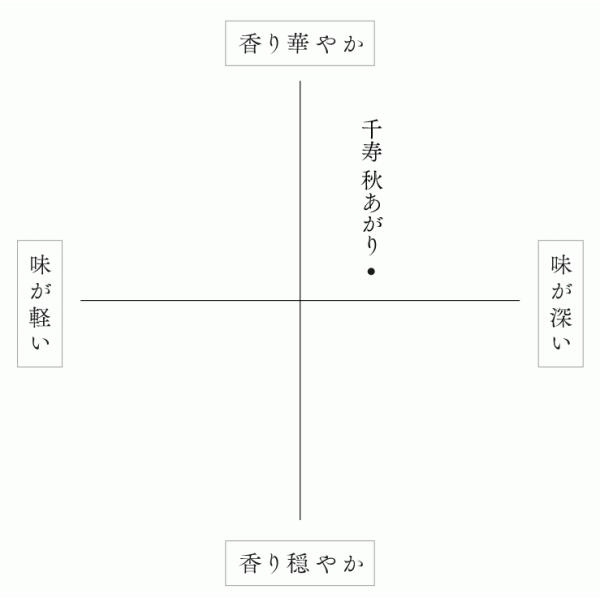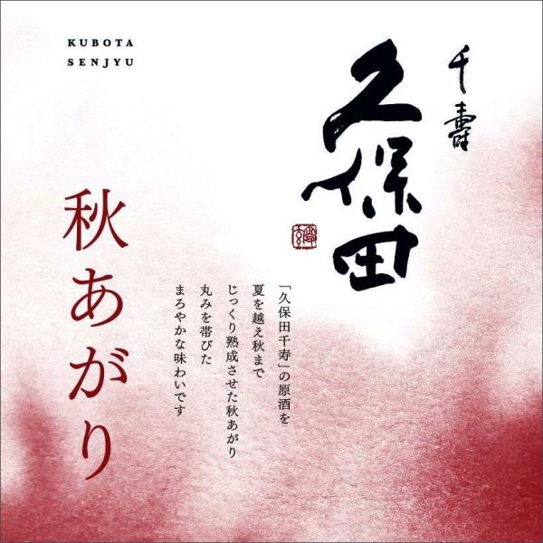 「秋あがり」とは、夏を越え秋まで熟成して酒質が落ち着き、円熟したお酒をいいます。『久保田 千寿 秋あがり』は、熟成による味の移ろいを感じていただくために、変化が分かりやすい原酒を選択。冬に仕込んだ『久保田 千寿』の原酒を、秋までじっくり熟成させました。搾りたての生原酒ならではの濃厚でしっかりとした味わいが、火入れ後の熟成によって、丸みを帯びたよりまろやかな味わいへと変化しています。