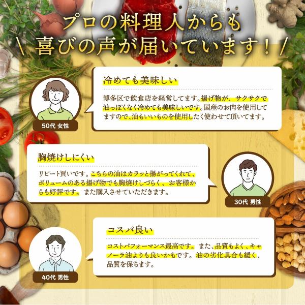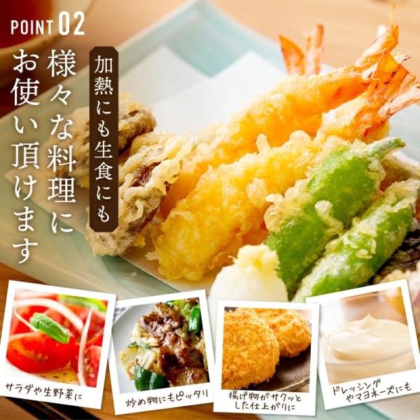 商品用途:揚げもの、炒めもの、サラダなど様々な料理にお使いいただけます。他の食用油の代用としてご使用できます。(オリーブオイル、米油、菜種油、キャノーラ油、大豆油、白絞油、ごま油、亜麻仁油、えごま油、グレープシードオイルなど)