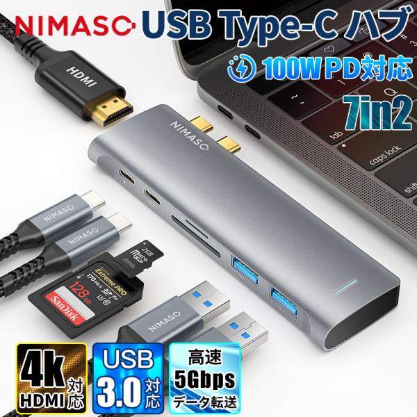 NIMASO 7in-2 USB Type-C ハブ MacBook Pro / Air 専用 100W PD急速充電対応 Thunderbolt 3 ポート USB C 3.0 出力ポート 2 * USB-A 3.0 ポート スロット搭載