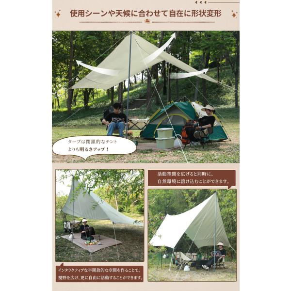 ★使用シーンや天候に合わせて自在に形状変形。タープは閉鎖的なテントよりも明るさアップ!!