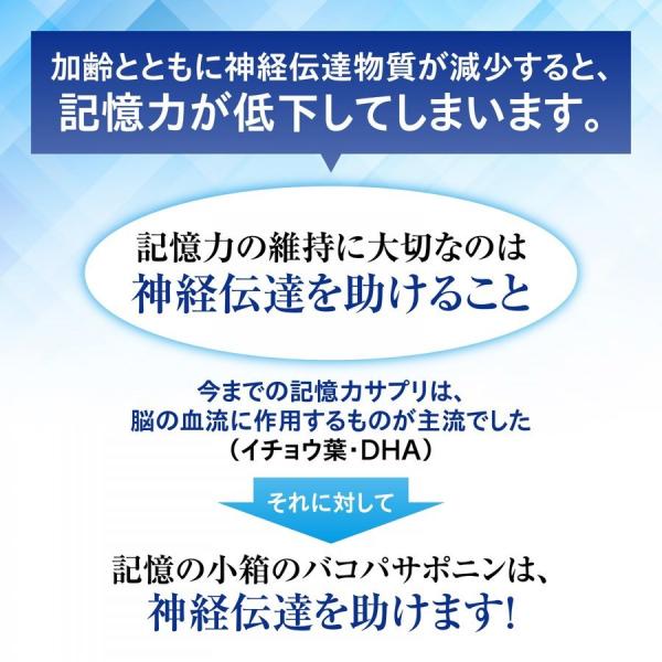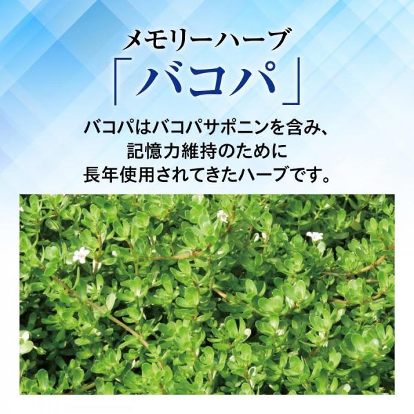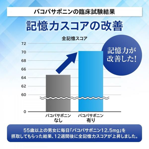 機能性表示食品 届出表示:本品にはバコパサポニンが含まれています。バコパサポニンには、認知機能の一部である記憶力(加齢により低下する日常生活で見聞きした情報を覚え、思い出す力)を維持する機能があることが報告されています。
