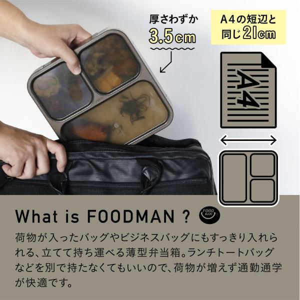 【立てて運べる】通勤や通学のバッグは、荷物でいっぱい!フードマンはそんなバッグにもすっきり入れられる「立てて運べる薄型弁当箱」。A4用紙の短辺と同じ210mmなので、書類などと一緒に持ち運んでも、すっきり収まります。ランチトートなど別持ちしなくて良いので、荷物が増えず通勤通学が快適!