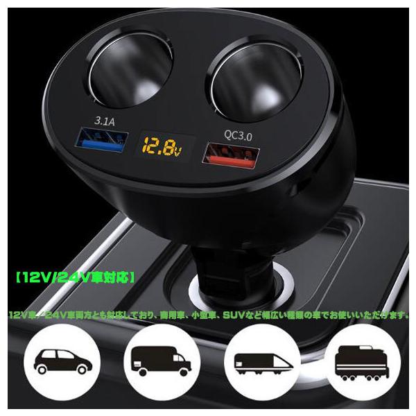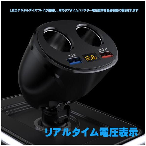 車用ソケット分配器 2連 シガーライター分配器 増設 2USBポート カーチャージャー 車載充電器 電圧バッテリー表示 電圧測定 充電急速充電 12/24V車対応